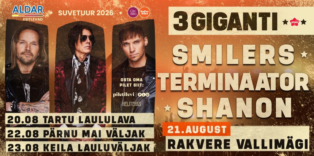 Aldar & City Alko esitlevad: 21.August RAKVERE // 3 GIGANTI TUUR 2026 – Terminaator, Smilers, Shanon LIVE Valmistu aasta live tuuriks, millest räägitakse veel kaua – Terminaator, Smilers ja Shanon panevad seljad kokku ja tulevad üle Eesti vägevale tuurile! Kolm Eesti rocki giganti, üks lava, üks õhtu – neljas linnas. Seda peab oma silmaga nägema! […]